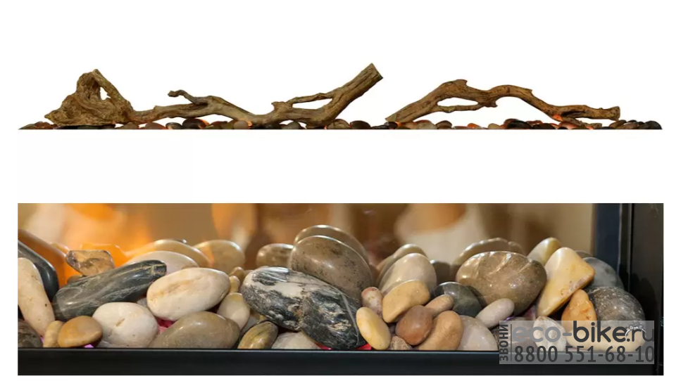 Свет от светодиодов просачивается сквозь элементы муляжа дров разного размера и переливается различными оттенками благодаря акриловому сверкающему покрытию топочной корзины, создавая визуальный эффект опаленных дров и сажи.