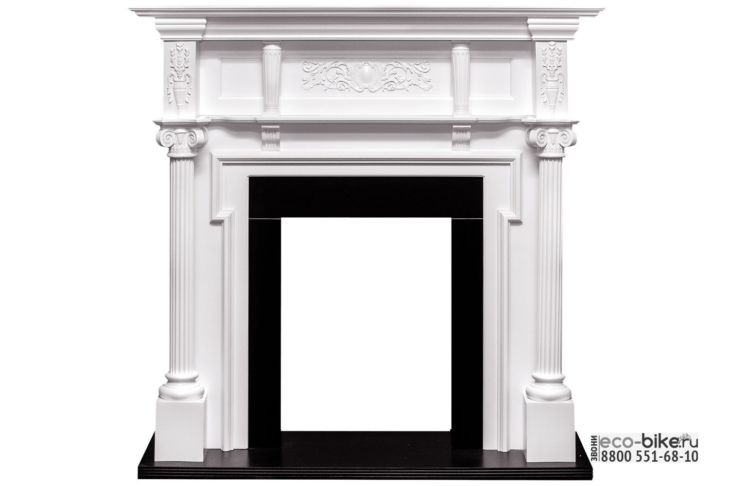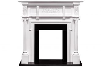 Пристенный каминный портал Oxford представлен в благородном белом цвете, дополненном контрастным оттенком в зоне очага и основания. Его дизайн сочетает строгие античные колонны и утонченный объемный орнамент в классическом стиле, создавая выразительный и элегантный элемент интерьера.